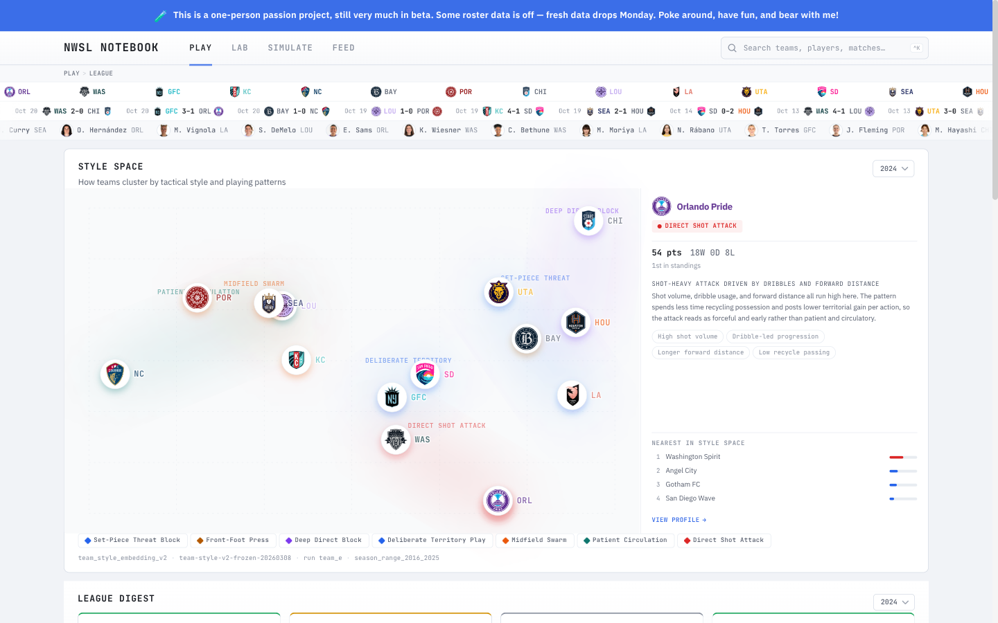 The NWSL lacks the infrastructure to publicize player performance data the way men's leagues do. NWSL Notebook fills that gap. By making players visible — their contributions quantified, their styles mapped, their trajectories tracked — it facilitates the fan relationships and league growth the NWSL needs. The site is free, open, and in beta.